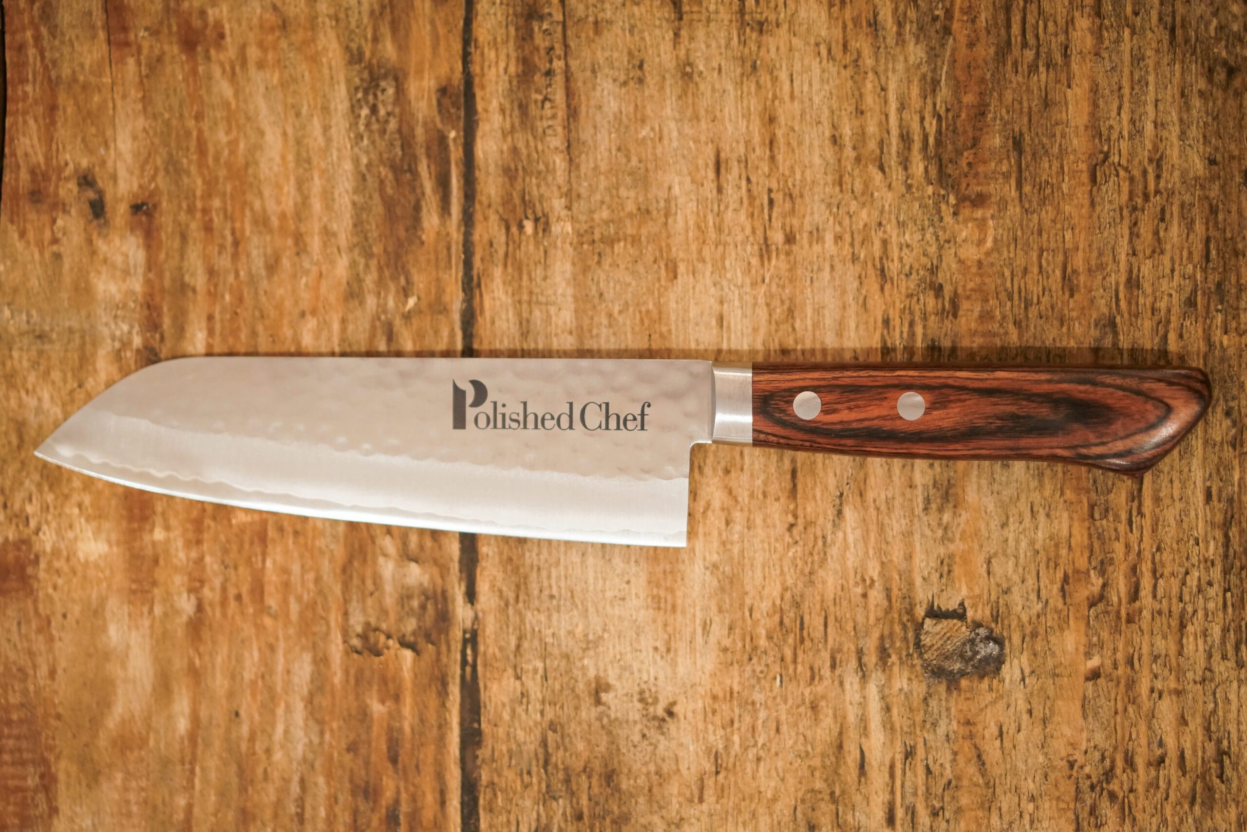 The Polished Chef Santoku is constructed with a core of VG10 stainless steel. VG10 is a high carbon, stainless steel manufactured by Takefu Special Steel Company. It’s fully stainless and holds an edge well for cutting food. The core is covered in a san-mai style of cladding using a softer stainless steel which receives a very attractive hammered finish. The knife is ground with a deep blade path which exposes the VG10 steel at the edge resulting in a nice hamon-like appearance. Knife comes pre sharpened.